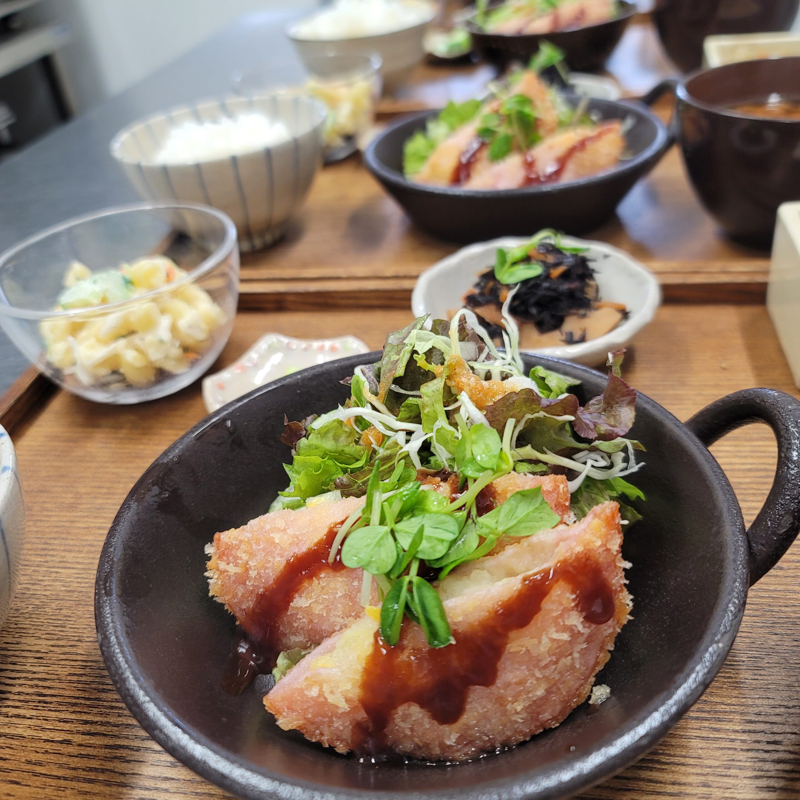 2025.11.11 日和cafe【週替わりランチ】 【週替わりランチ】 ハムカツ(ポテサラ入り)蓮根とひじきの煮物ブロッコリーの胡麻和え 今週のメインはハムカツ♥️ポテサラ入りでワクワクします😍今週も宜しくお願いいたします💕