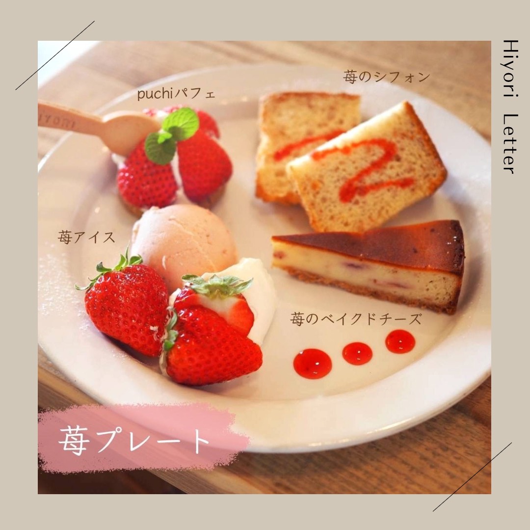 日和のこだわりがた〜んまり詰まった苺スイーツが、一皿に集結する「苺プレート」。単品メニューでも人気のふわふわ食感の「苺シフォン」と、濃密な生地からフレッシュな苺の香りが広がる「苺ベイクドチーズケーキ」が並びます。さらに、苺アイスと苺のプチパフェも添えて。プチパフェの下には、きなことあんこのクッキーを敷き、中にはあんこを忍ばせました。ちょっと日和らしく、和チックに。あんこ×生クリーム×苺は相性抜群の組み合わせです。春だけの味わいをお楽しみください🍓
